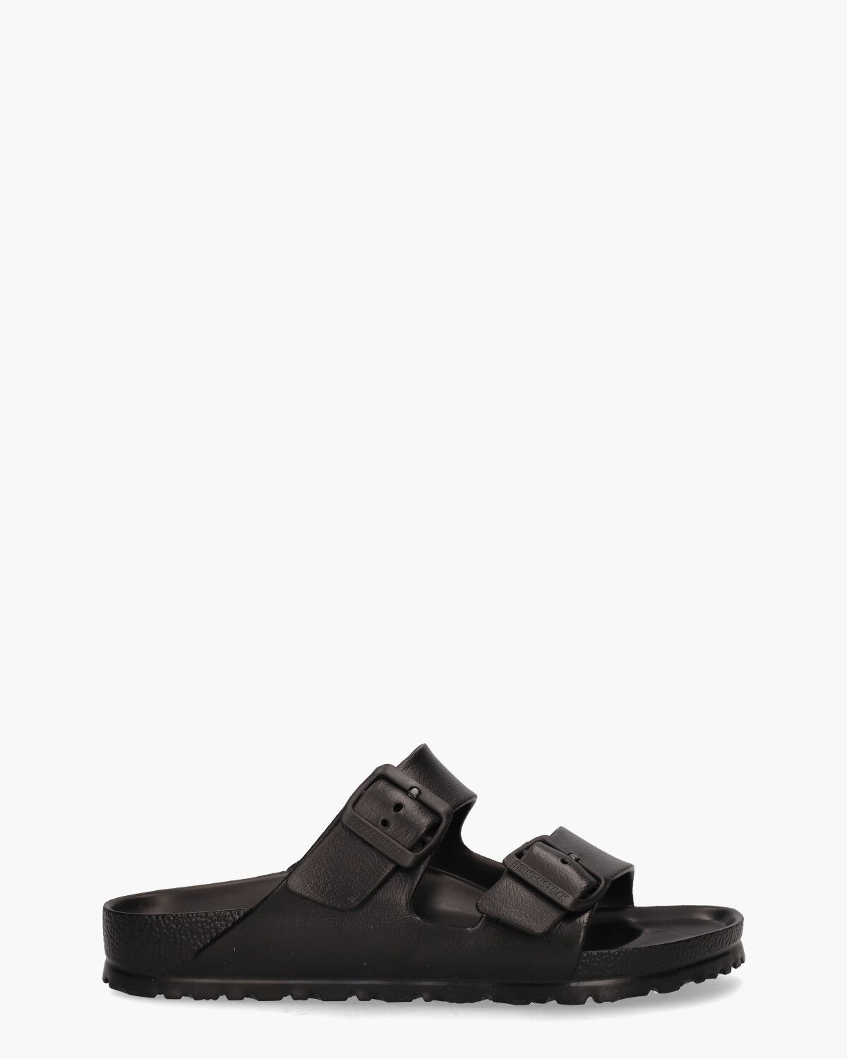 Ultralichte slippers voor heren Arizona Essentials 0129423 uit de collectie van Birkenstock. Deze waterbestendige slides hebben een upper van zwart kunststof materiaal. Het voetbed is voorgevormd en zorgt voor extra comfort tijdens het lopen. De twee wreefbanden met zwarte logo-gespen zijn verstelbaar. Een EVA-zool en branding aan de zijkant