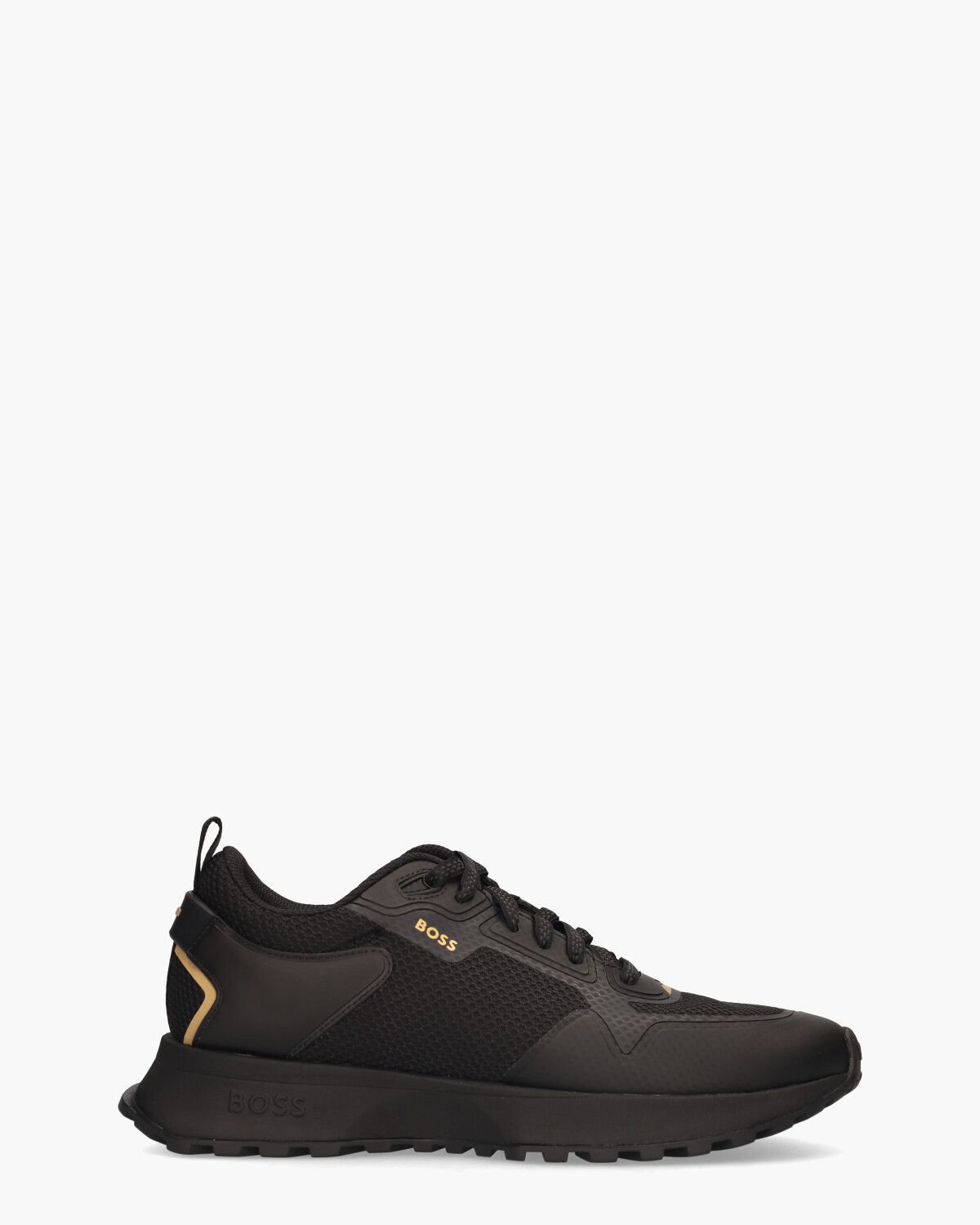 Deze zwarte sneaker van BOSS Jonah wordt gekenmerkt door zijn eigentijdse design en een materiaalmix van synthetische stof, mesh en rubber. De binnenvoering van de runner is van textiel gemaakt en beschikt over een uitneembaar voetbed. De sportieve zwarte rubberen zool heeft een grof profiel en is voorzien van het BOSS-logo. Gouden accenten