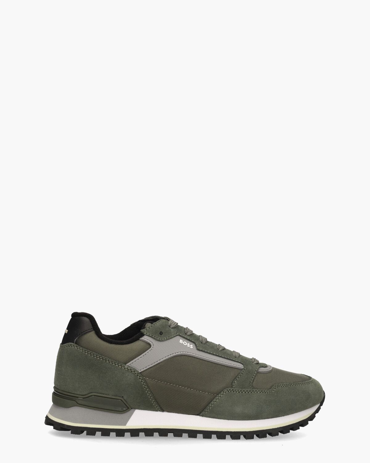 Sneaker model Parkour-L Run voor heren uit de collectie van BOSS. Deze lage herensneakers hebben een bovenzijde van stof, suède en mesh in een groene tint met lichtgrijze rubberen accenten. De binnenkant is in stof uitgevoerd. Op de tong en aan de zijkant is het merklogo zichtbaar en op het zwarte hielstuk vormt sierboorduursel een