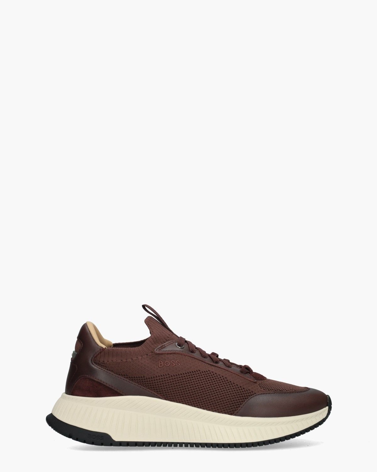 Een sneaker die stijl en comfort samenbrengt. Deze bordeauxrode herensneaker TTNM EVO van BOSS is uitgevoerd in een sokmodel met een bovenwerk van tricot. Ppanelen van leer, suède, rubber en gerecycled polyester zorgen voor diepte in het design. De EVA-zool van rubber biedt een lichte en dempende basis en het uitneembare voetbed