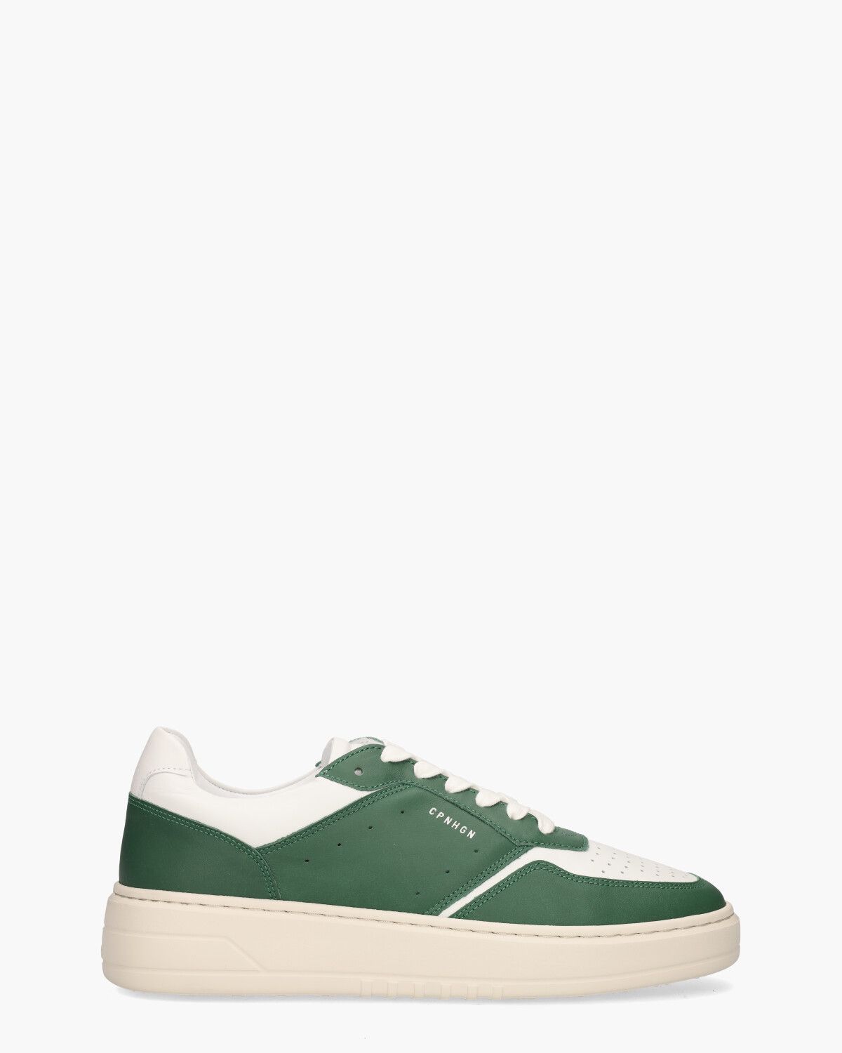 Low-top sneakers voor heren CPH1M uit de collectie van het merk Copenhagen. Deze sneaks hebben een upper van groen en wit leer afgewerkt met stiksels en perforaties. De binnenkant en het uitneembaar voetbed zijn ook volledig in leer uitgevoerd. De off-white zool is gemaakt van lichtgewicht rubber. Zilverkleurige logo's op de tong en opzij en