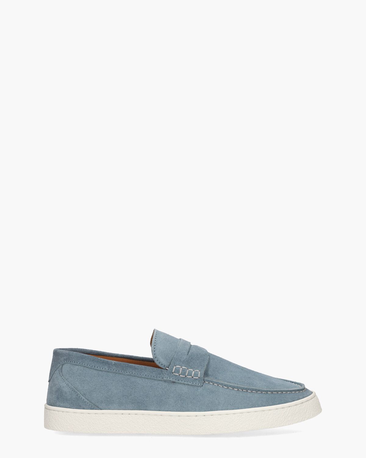 Loafers voor heren Twan uit de collectie van Rapid Soul. Deze lichtblauwe instappers hebben een bovenzijde van zacht suède. De binnenkant is in soepel leer uitgevoerd en voorzien van een uitneembaar voetbed. Het bovenwerk heeft een klassieke loafer-afwerking met opgestikte neusnaad en sierstiksels. De witte rubberen zool van circa 2,5 cm