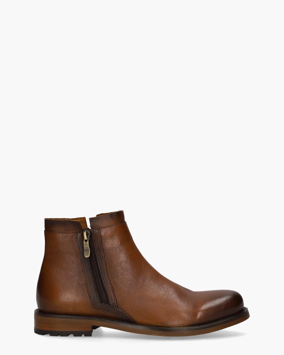 Met de Paco enkelboot van Daniel Kenneth geef je je outfit direct meer karakter. Deze laars is uitgevoerd in generfd cognackleurig leer met een natuurlijk kleurverloop en een glanzende finish voor een robuuste uitstraling. De ritsen aan beide zijden van de circa 12,5 cm hoge schacht zijn niet alleen functioneel, maar versterken ook de stoere