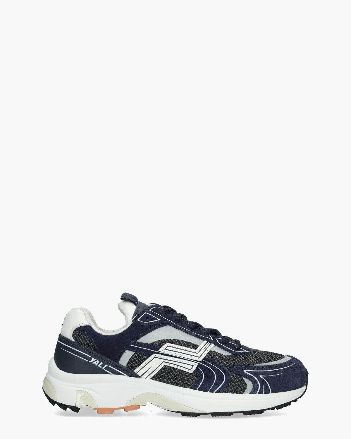 Futuristische stijl met een sportieve edge. De FILMORE Yali herensneakers brengen Y2K-stijl naar het nu met een uitgesproken silhouet. Het bovenwerk van leer en suède in donkerblauw en wit wordt aangevuld met ademend mesh en opvallende reflecterende details. De stevige zoolconstructie uit gerecycled materiaal is lichtgewicht en combineert