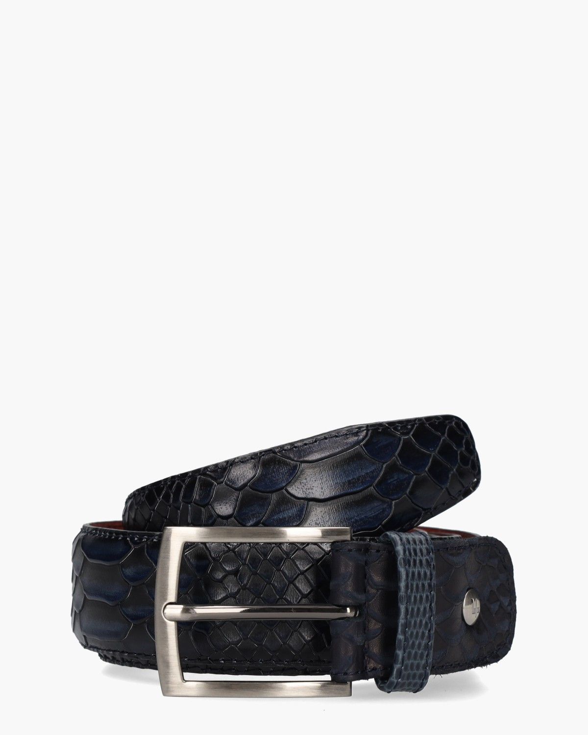 Deze Floris Van Bommel herenriem De Belter 10.12/CFM-10043-41-01 geeft je outfit meteen een verfijnde uitstraling. Het donkerblauwe leer met slangenstructuur creëert een luxe en gelaagd effect dat perfect past bij zowel zakelijke looks als een doordeweekse casual stijl. De matzilveren gesp houdt het geheel strak en tijdloos, terwijl het
