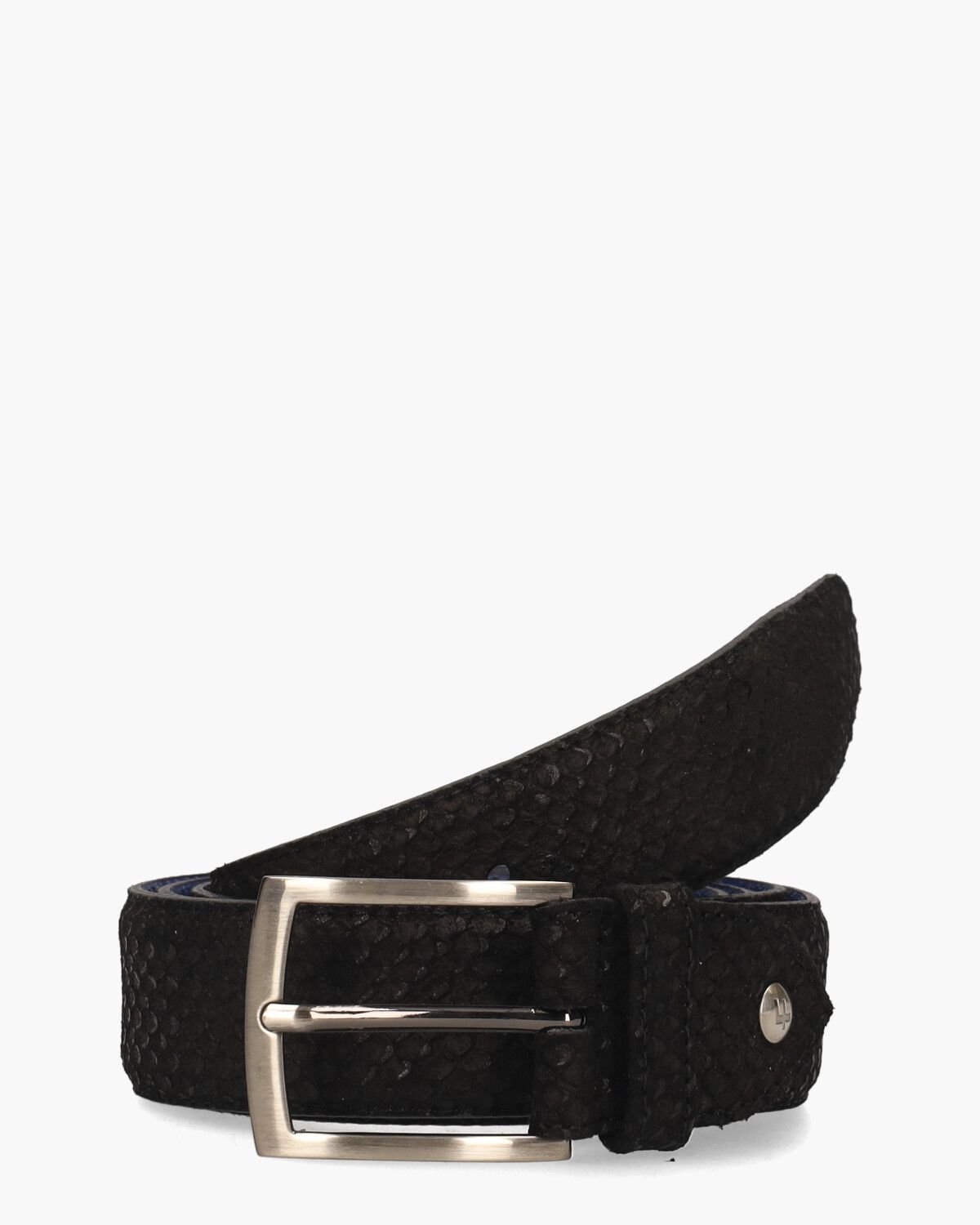 Herenriem De Belter 32.79/CFM-10083-10-03 van het Nederlandse merk Floris van Bommel is uitgevoerd in zwart suède met een opvallend reliëf. De zilverkleurige, rechthoekige gesp geeft de riem een tijdloze uitstraling, terwijl de binnenkant van glad leer voor extra comfort zorgt. Met een breedte van 3,5 cm biedt deze riem een perfecte balans