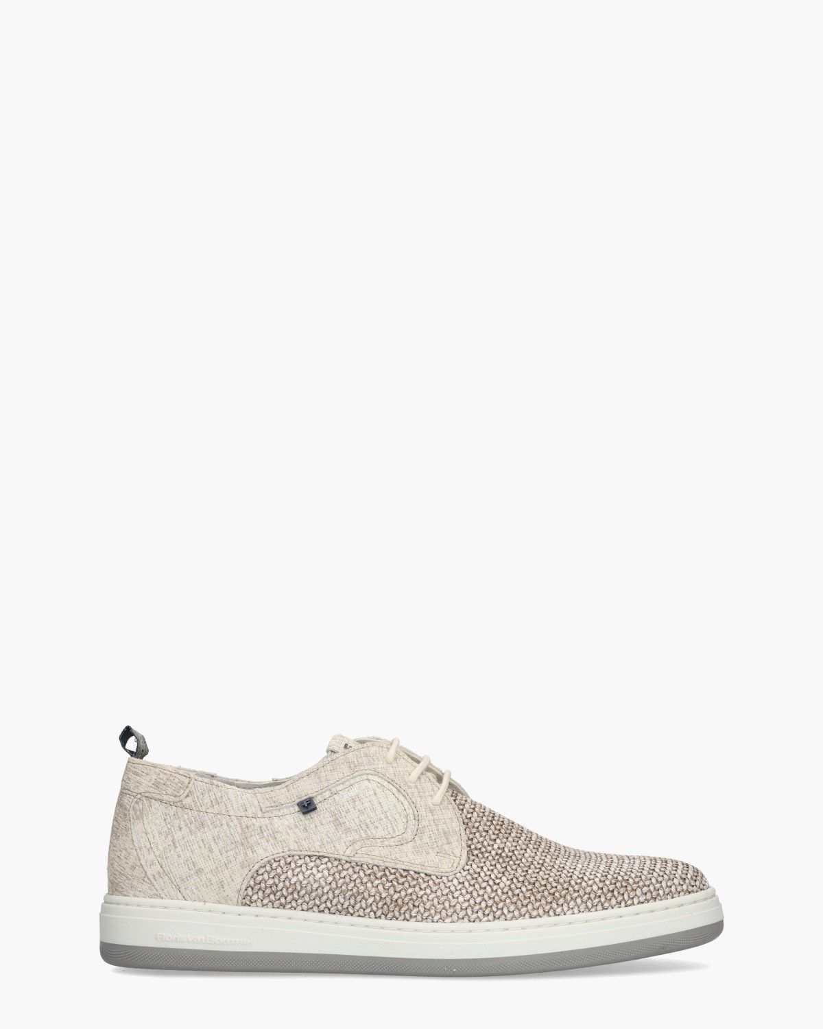 Zomers, licht en vol karakter. De Floris van Bommel De Dijker 03.12/SFM-30309-34-01 herensneaker valt direct op door het bijzondere bovenwerk van geprint en gevlochten textiel in beige en taupe. Opvallend stikwerk en het blauwe rubberen F-je aan de zijkant zorgen voor een herkenbaar detail. Branding op de tong en langs de zool