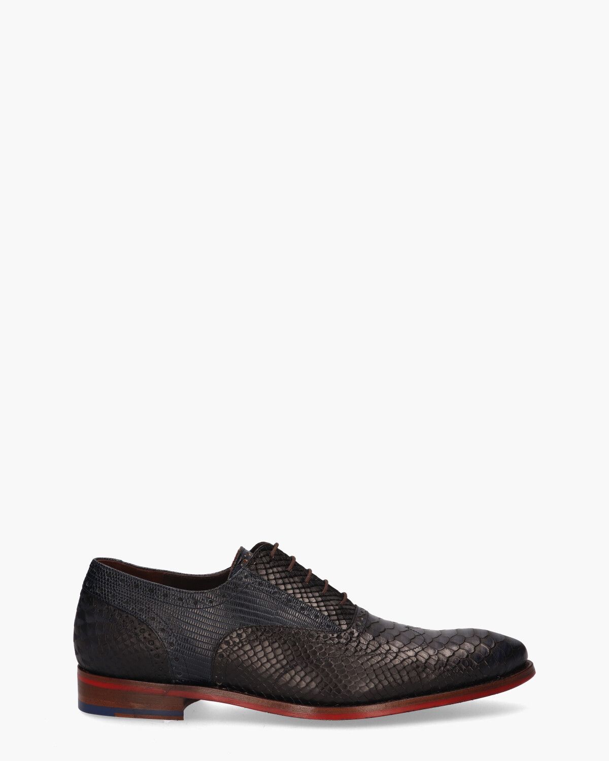 Molières voor heren De Stapper 05.17/SFM-30238-41-03 uit de collectie van Floris Van Bommel. Gemaakt van kalfsleer in twee tinten blauw en met verschillende printjes val je met deze classic veterschoenen ècht op. De broguebewerking geeft de derby extra elegantie en de rode zool en het kobaltblauwe detail in de hak zorgen voor een sportieve