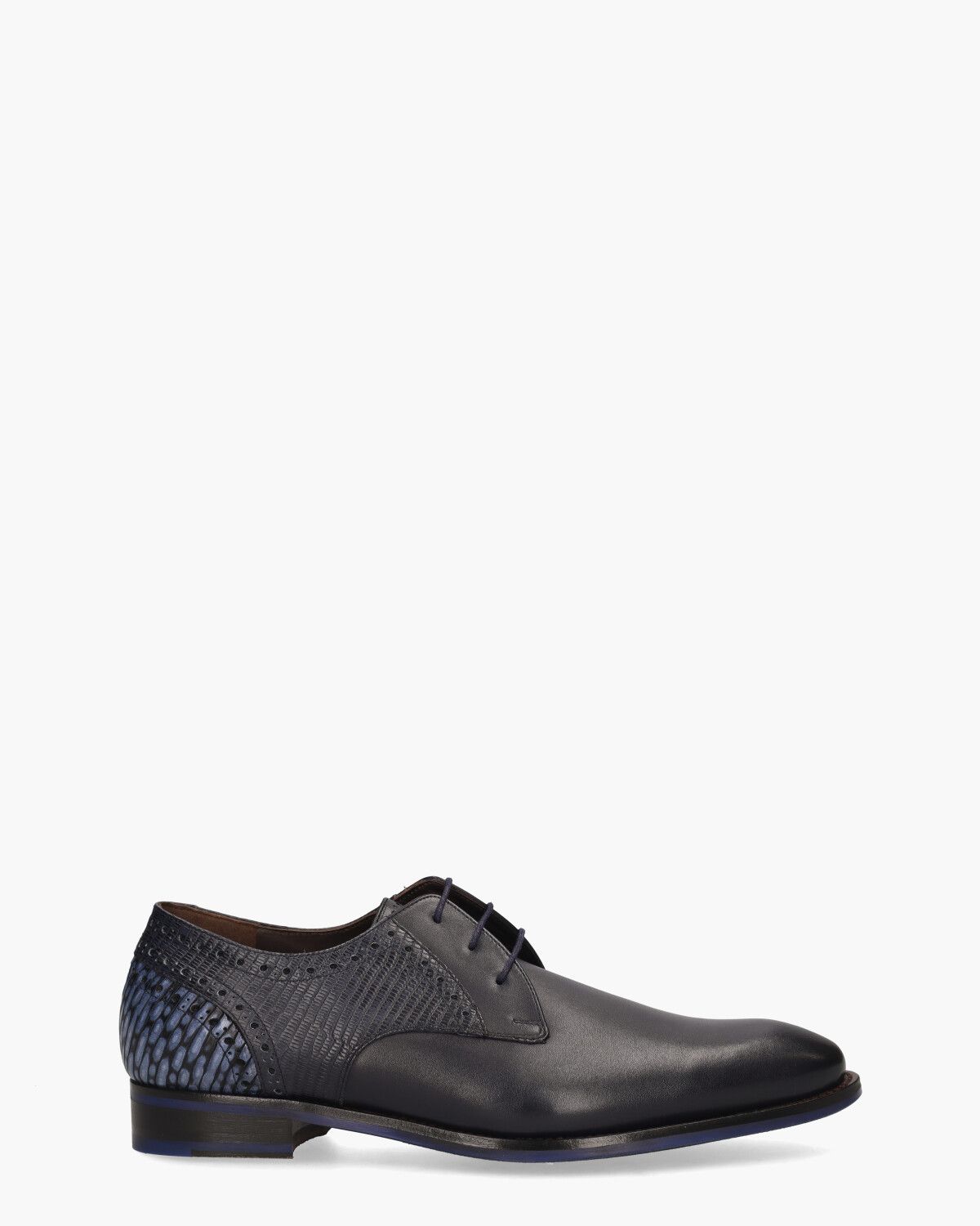 Veterschoenen voor heren De Stapper 39.26/SFM-30361-41-03 uit de collectie van het Nederlandse merk Floris Van Bommel. Dit model heeft een upper van donkerblauw kalfsleer. Het leer met verschillende printjes en de brogue-accenten geven de shoes extra stijl. Het binnenwerk is in leer en suède uitgevoerd en voorzien van een vast voetbed.