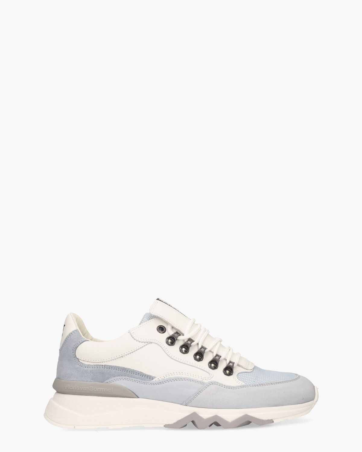 Deze handgemaakte Floris Van Bommel De Zager 01.24/SFM-10135-42-02 sneakers voor heren combineren ambacht en stijl. Het ontwerp speelt met contrasten in materialen zoals leer, suède en mesh in de kleuren wit en lichtblauw. Binnenin bieden een leren voering en een uitneembaar voetbed ultiem draagcomfort. De witte rubberen runningzool met