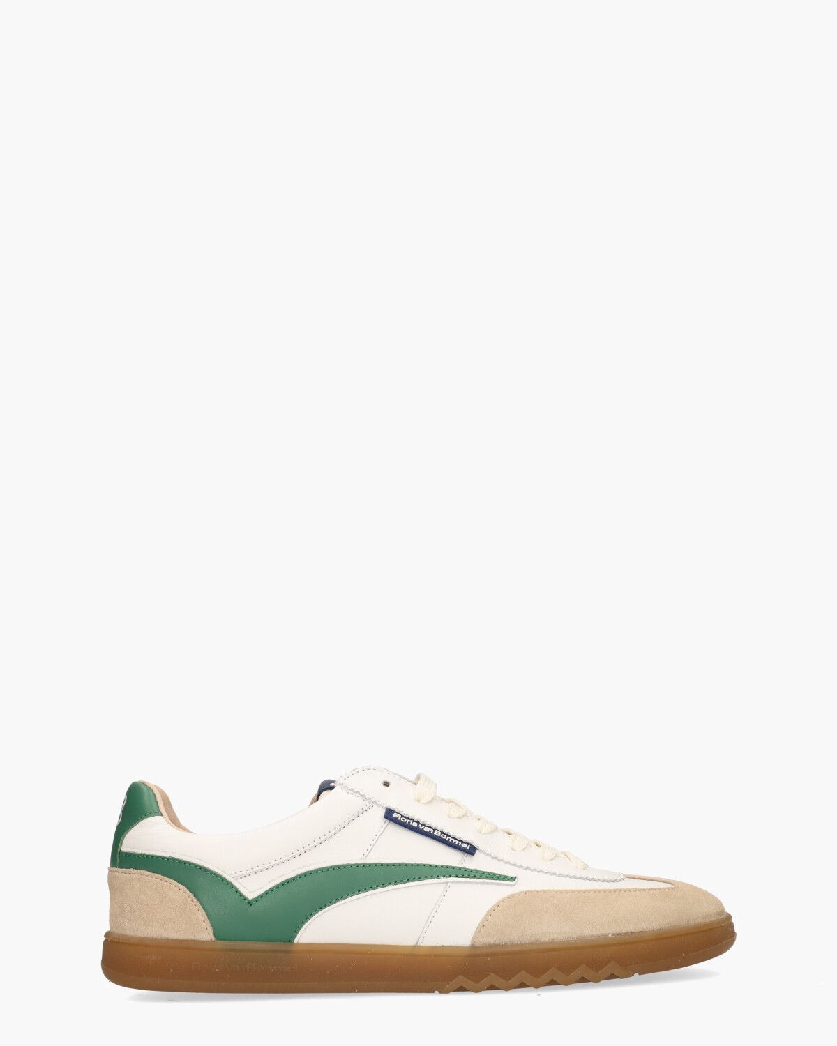 Deze herensneakers van Floris van Bommel, De Zaler 01.12/SFM-10224-50-01, zijn vervaardigd van hoogwaardig wit leer en beige suède afgewerkt met opvallende groene lederen belijning opzij en op de hielcap. De sneaker is voorzien van een lichtgewicht cupzool met een opvallend gummy zigzag-patroon aan de zijkant, wat zorgt voor de herkenbare