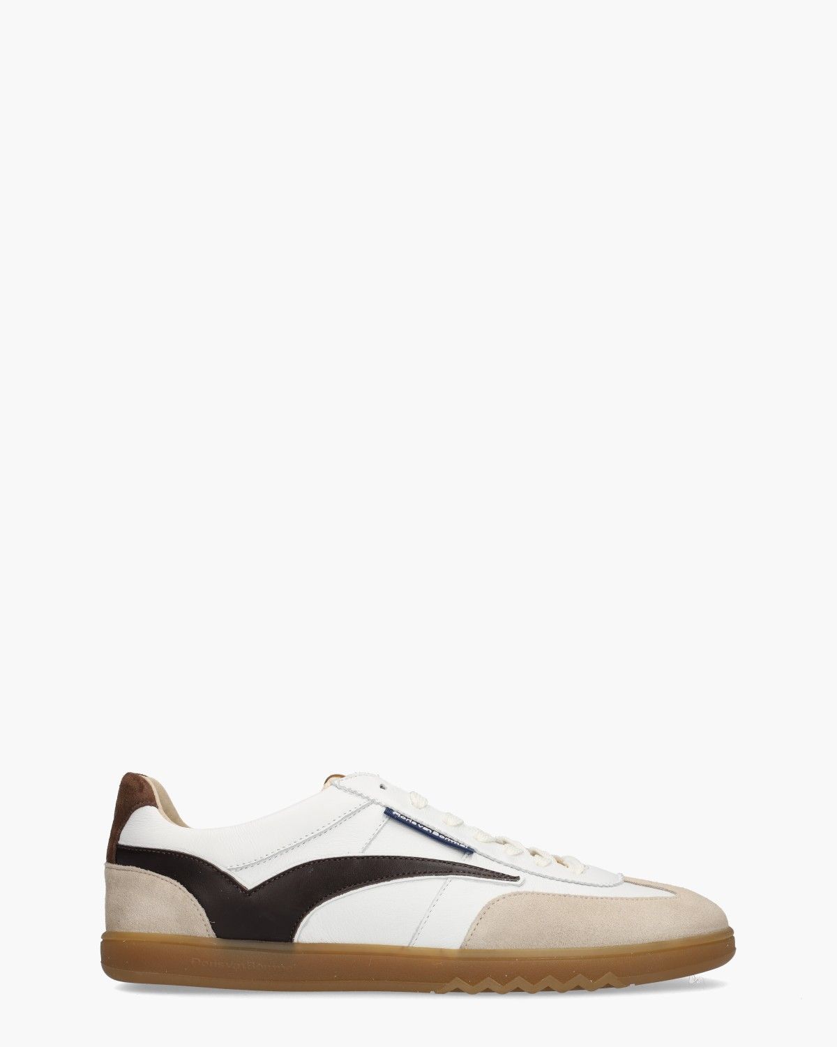 Deze De Zaler 01.22/sfm-10224-60-09 herensneaker van Floris Van Bommel combineert contrasterende tinten wit, zwart, beige en donkerbruin tot een strak geheel. Het leren en suède bovenwerk voelt luxe aan en krijgt een dynamische uitstraling dankzij de gekartelde details geïnspireerd op vintage sportdesigns. Binnenin zorgen de leren