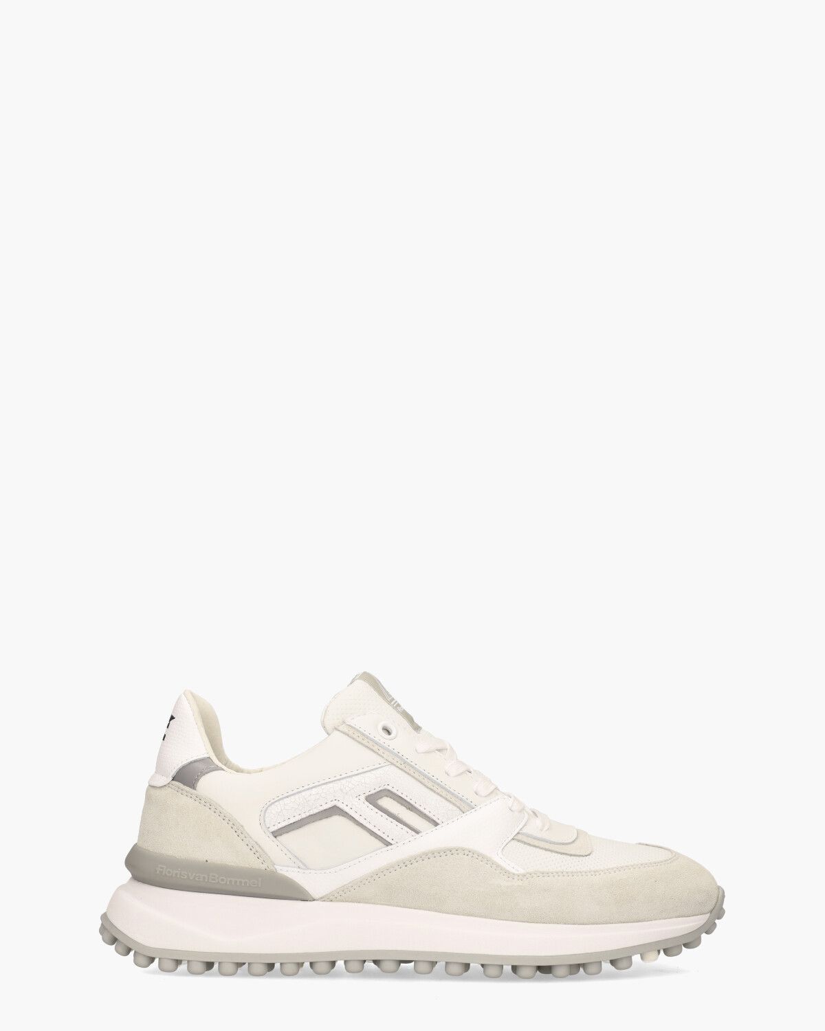 Dit handgemaakte model van Floris Van Bommel Noppi 29.10/SFM-10139-60-02 combineert leer, suède, mesh en printleer in wit, off-white en lichtgrijs. De lederen binnenkant, met een uitneembaar voetbed, biedt optimaal draagcomfort. De witte rubberen runningzool met lichtgrijze noppen en een gebroken witte color splash zorgt voor een
