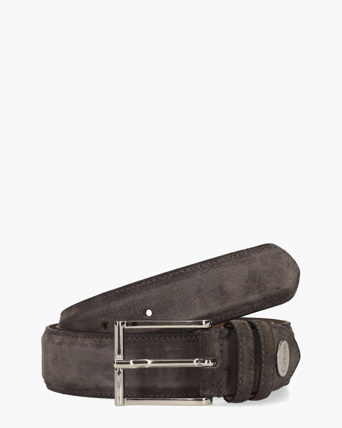 Riem voor heren 9333835 uit de collectie van het Nederlandse merk Greve. Deze riem is uitgevoerd in donkerbruin suède. De binnenkant is van bruin glad leer gemaakt. De riem is 3,5 cm breed. Een zilveren gesp en een zilverkleurige Greve button maken de ceintuur af. Kleur: donkergrijs. (Carbonio) Met deze bijpassende Greve