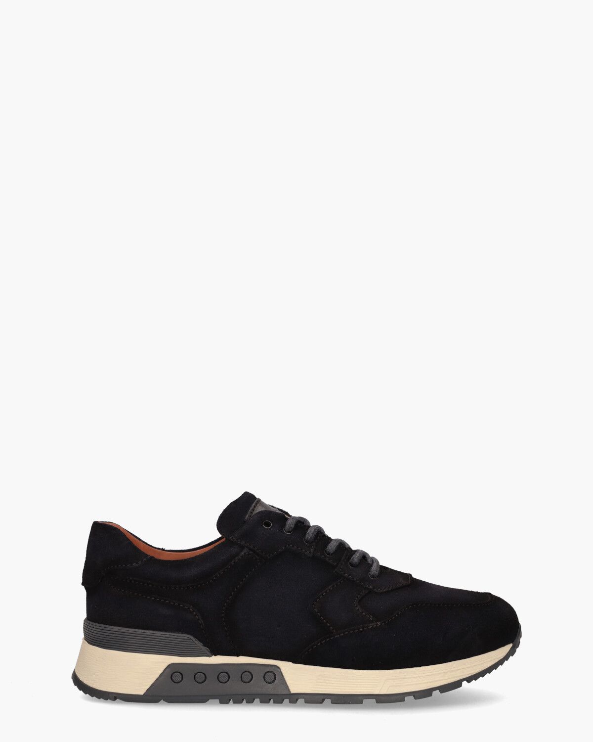 Sneakers voor heren Haarlem 4289.88-005 uit de collectie van Greve. Dit sportieve model heeft een bovenwerk van vintage gebrusht suède met gestikte overlays in een donkerblauwe tint. De schoen is gevoerd met leer en het voetbed is uitneembaar. De off-white/grijze rubberen zool heeft profiel voor goede grip. Op de tong is een lederen