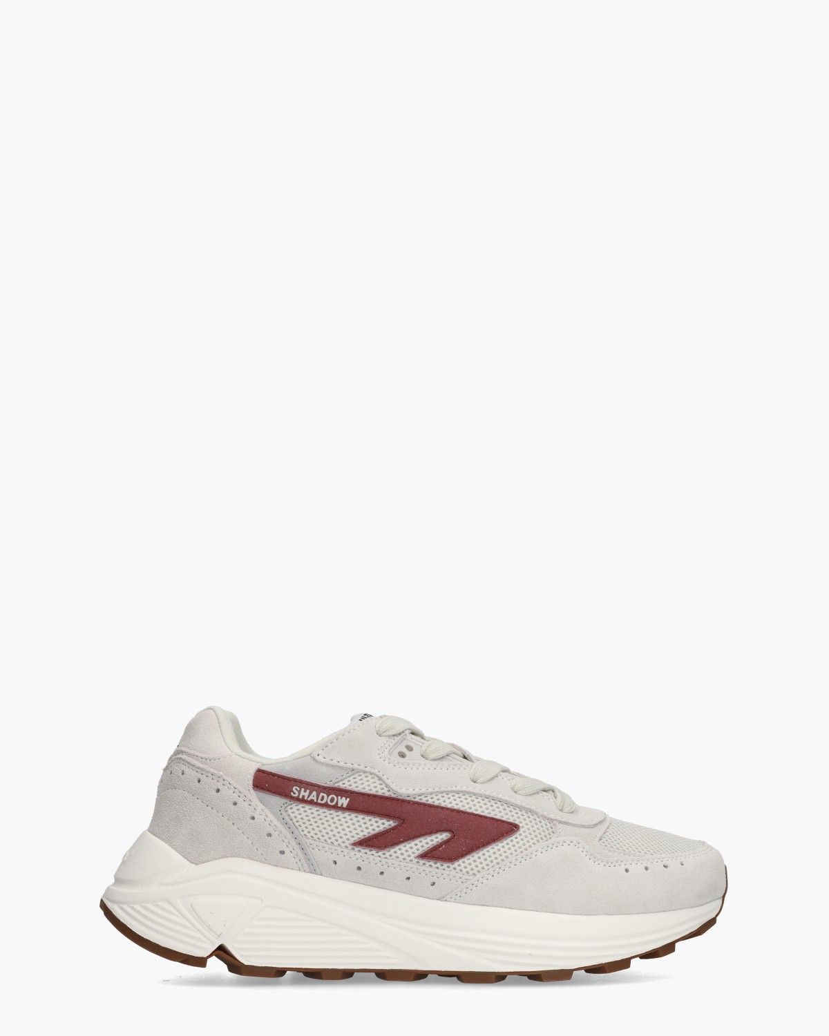 Deze HI-TEC HTS Shadow RGS herensneakers hebben een bovenwerk van lichtgrijs suède en mesh met bordeauxrode accenten. De meshvoering en het uitneembare voetbed zorgen voor comfort. De witte rubberen Vibram zool met bruine onderzool biedt grip en demping. Op de tong, de hielcap en de zool zijn HI-TEC-logo's te zien. Perforaties,