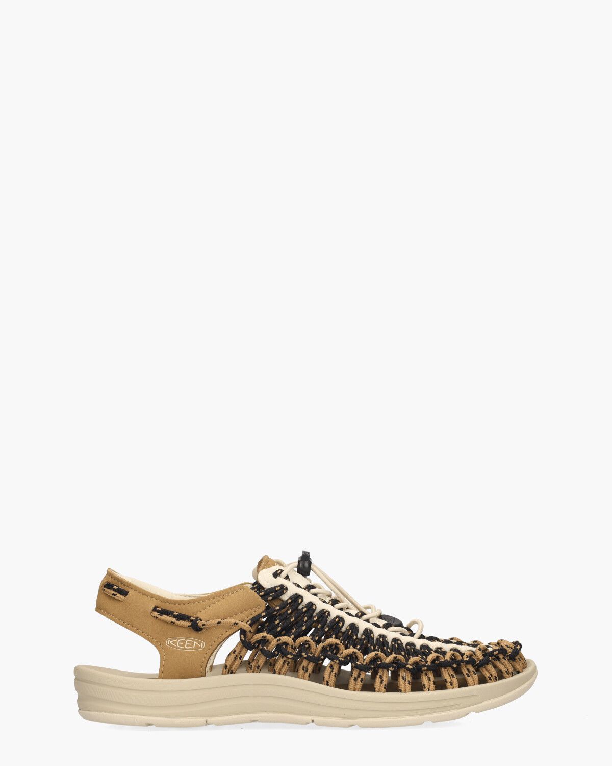 De Keen Uneek herensandaal valt op door zijn unieke constructie van gevlochten koorden. Deze techniek zorgt voor een flexibele pasvorm die meebeweegt met je voet. De cognackleurige basis, gemaakt van gerecycled polyester, met zwarte en gebroken witte accenten geeft de sandaal een opvallende en technische uitstraling. Het anatomisch