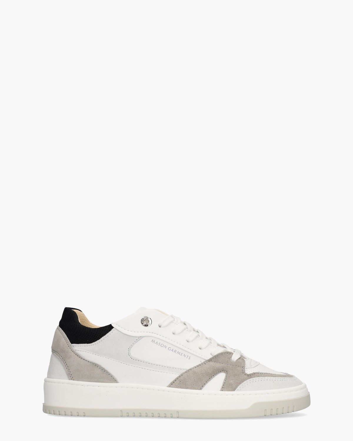 De Matera Primo 14A herensneaker van Mason Garments combineert wit en beige in een uitgebalanceerd ontwerp retro-ontwerp. Het bovenwerk van leer en suède voelt luxe aan en krijgt extra diepte door de zwarte mesh hielcap. De perforaties op de neus geven de sneaker een luchtige, sportieve touch. Dankzij de zachte voering van mesh en