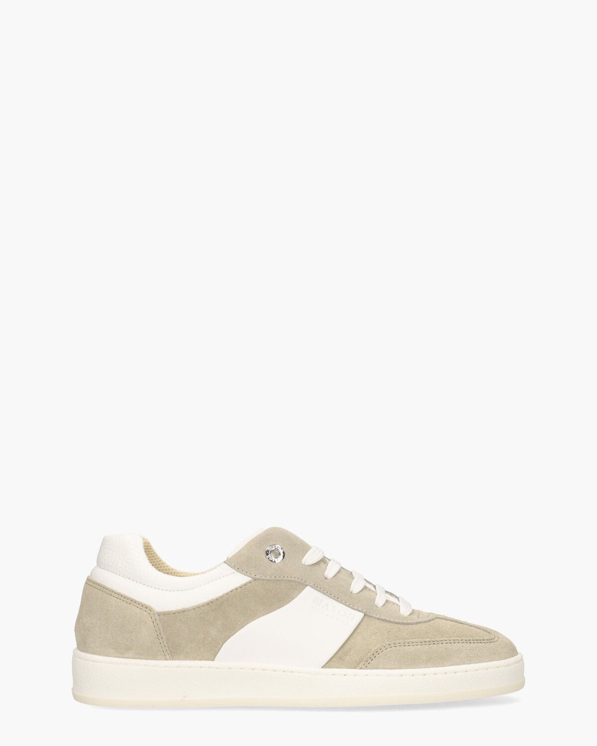 Sneakers in vintage indoor sports stijl voor heren van het Italiaanse merk Mason Garments. Deze handgemaakte sneakers Napoli Tradizionale 11B hebben een bovenwerk van beige suède en wit gestructureerd leer. De binnenzijde, uitgevoerd in zacht meshmateriaal, biedt optimaal comfort. De ergonomische, uitneembare inlegzool van schuim, bekleed