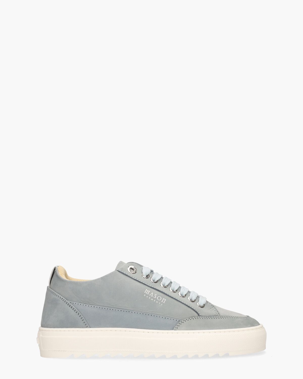 De Tia Originale 24A sneakers voor heren van het Italiaanse merk Mason Garments combineren stijl en vakmanschap. Dit handgemaakte model heeft een bovenwerk van zacht lichtblauw nubuckleer, gecombineerd met een binnenzijde van soepel leer en ademend mesh voor optimaal draagcomfort. Het comfortabele, uitneembare voetbed biedt extra