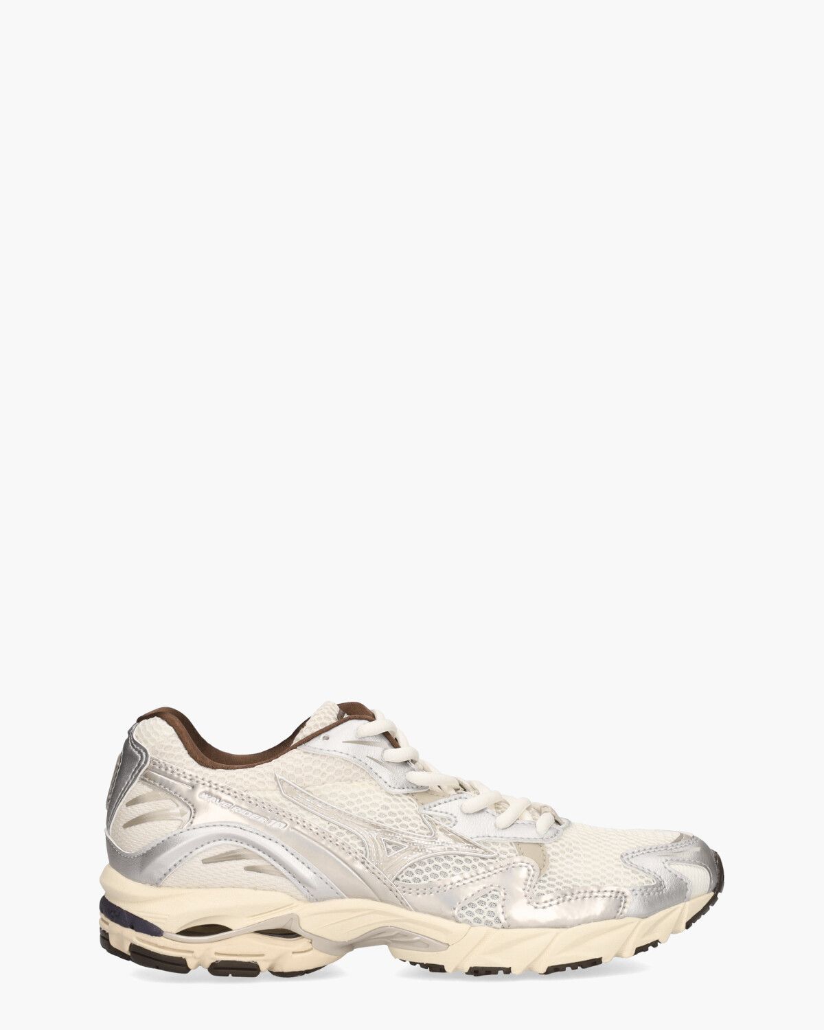 De Wave Rider 10 D1GA243103 sneakers voor heren van het Japanse merk Mizuno zijn ontworpen als technische hardloopschoenen. Ze hebben een bovenwerk van gebroken wit mesh en zilverkleurig kunststof materiaal, gecombineerd met een donkerbruine stoffen binnenzijde en een uitneembaar voetbed. De multicolor bulky rubberen zool geeft de sneakers