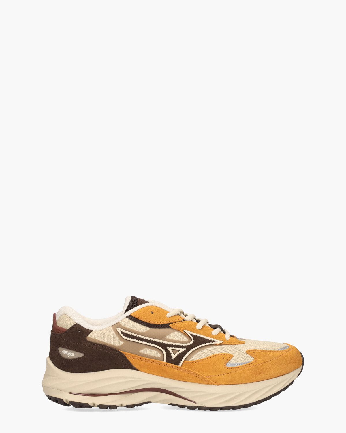 Sneakers voor heren Wave Rider Beta D1GA30917 uit de collectie van het Japanse label Mizuno. Dit technische runningmodel heeft een bovenwerk van suède en mesh in geel, donkerbruin en ecru. De binnenkant is van stof en bevat een uitneembaar voetbed voor comfort. De bulky rubberen zool met een bruine stripe draagt bij aan de vintage look. Ecru