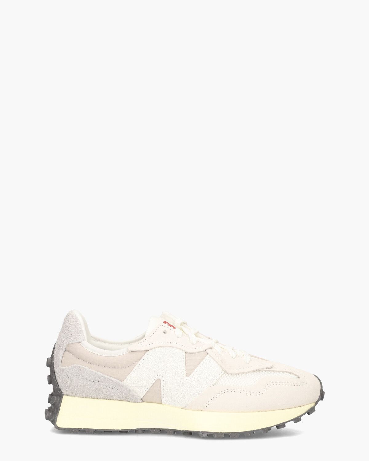 Throw back 70's style sneakers voor heren van New Balance. Deze heritage trainer U327WRB heeft een bovenwerk van synthetische stof en suède in een gebroken witte tint. De binnenzijde is in mesh uitgevoerd. Kenmerkend is de oversized witte'N'van New Balance op de zijkant van de sneaker. Merklogo's op de tong en aan de zijkant, gebroken