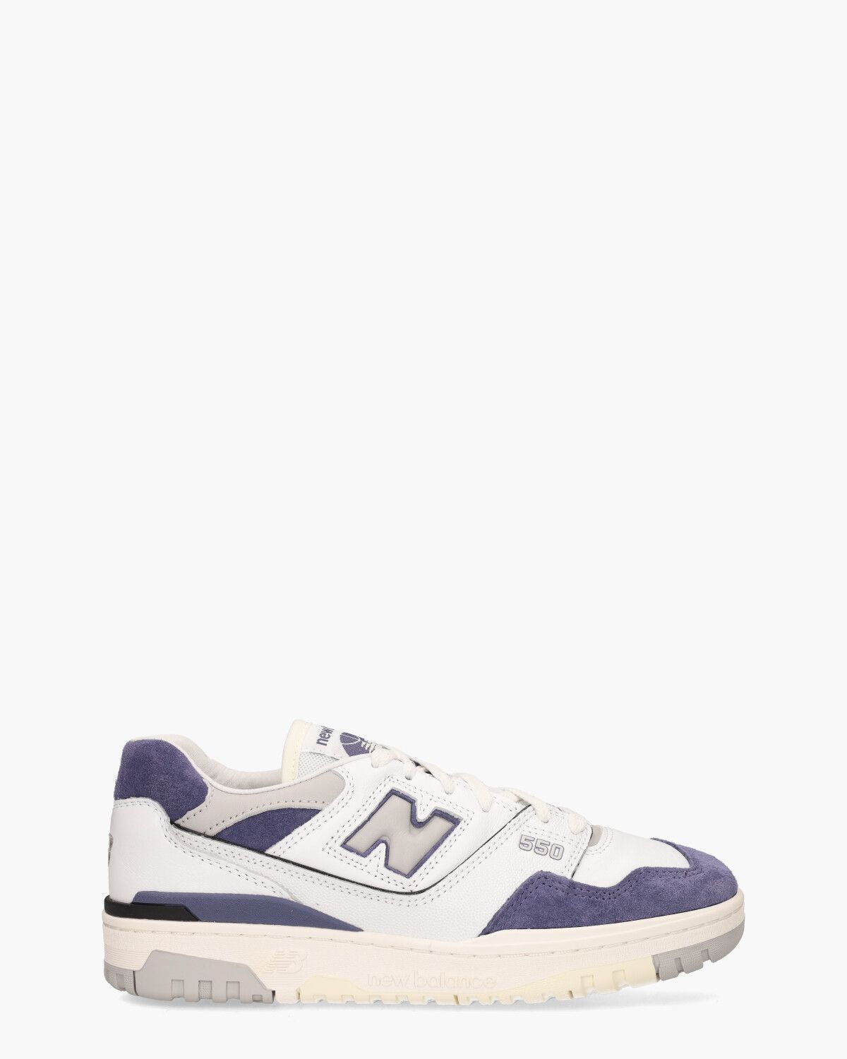 Deze New Balance'89 retro basketbalschoen model BB550BWG uit de NB 550-serie heeft een bovenwerk van leer, synthetisch materiaal, suède en mesh in de kleuren wit, blauw en lichtgrijs. De iconische'N'van New Balance prijkt op de zijkanten van de sneaker. Verder zijn merklogo's terug te vinden op de tong, het hielstuk en de zool. De