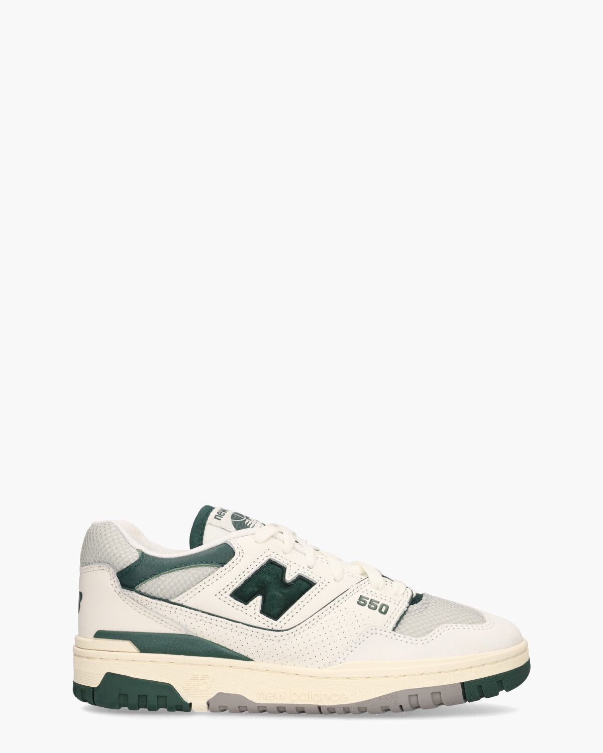 Deze New Balance'89 retro basketbalschoen model BB550CPE heeft een bovenwerk van leer, synthetisch materiaal, suède en mesh in de kleuren off-white, donkergroen en lichtgrijs. De iconische'N'van New Balance prijkt op de zijkanten van de sneaker. Verder is de branding terug te vinden op de tong, het hielstuk en de zool. De binnenzijde,