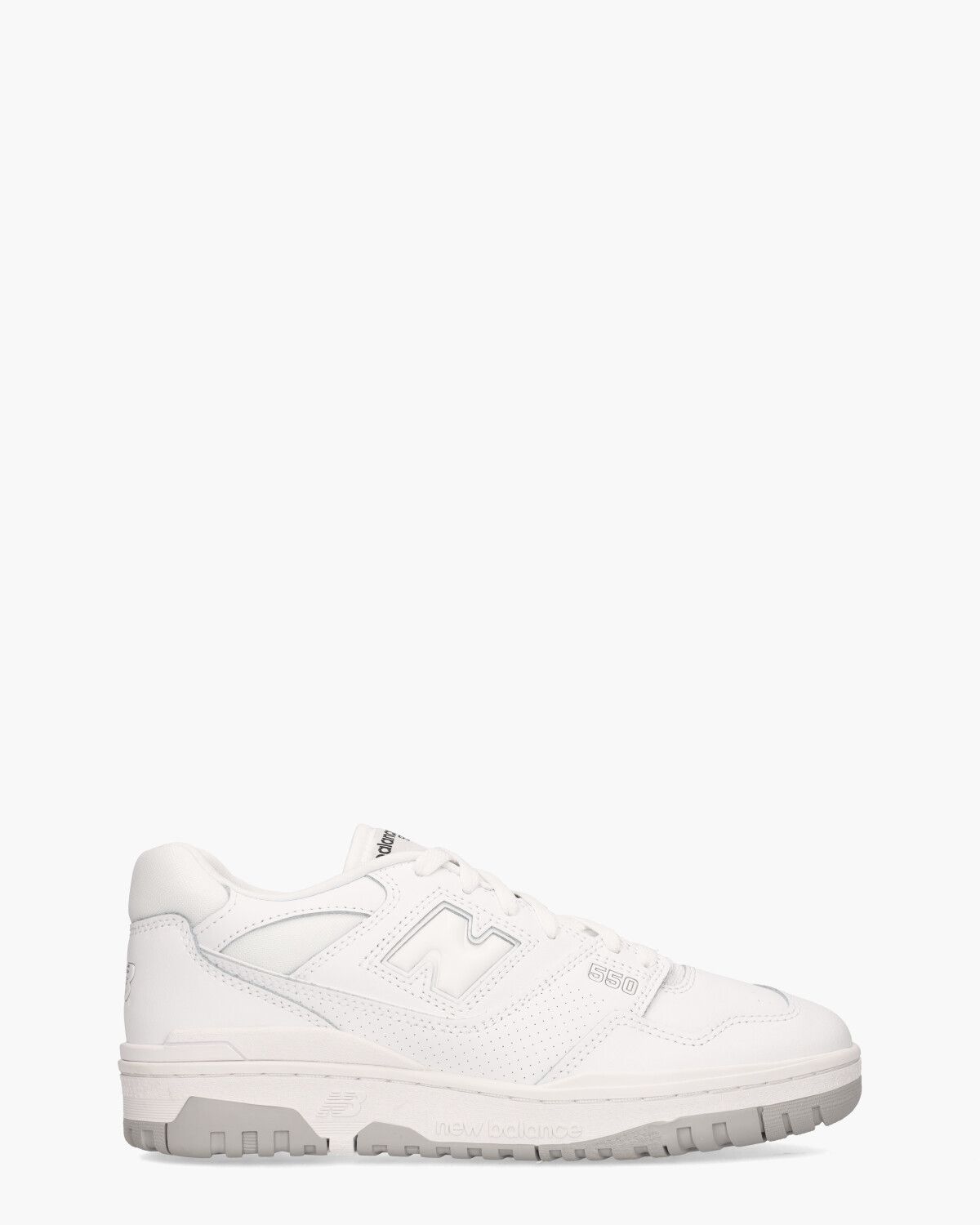 De New Balance'89 retro basketbalschoen, model BB550PB1, combineert een klassiek ontwerp met moderne materialen. Het witte bovenwerk bestaat uit een mix van leer, synthetisch materiaal en mesh. Het iconische'N'-logo siert de zijkanten van de sneaker, terwijl de branding ook te vinden is op de tong, het hielstuk en de zool. De binnenzijde