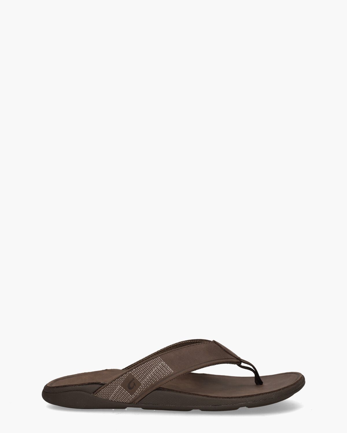 Slippers voor heren Tuahine 10465-6363 uit de collectie van het Amerikaanse merk OluKai. Dit supercomfortabele ontwerp heeft een bovenwerk van waterproof donkerbruin nubuckleer. De voering is ook van leer gemaakt en het anatomische voorgevormde voetbed is in PU-materiaal uitgevoerd. De rubberen EVA-zool met midsole demping zorgt voor extra