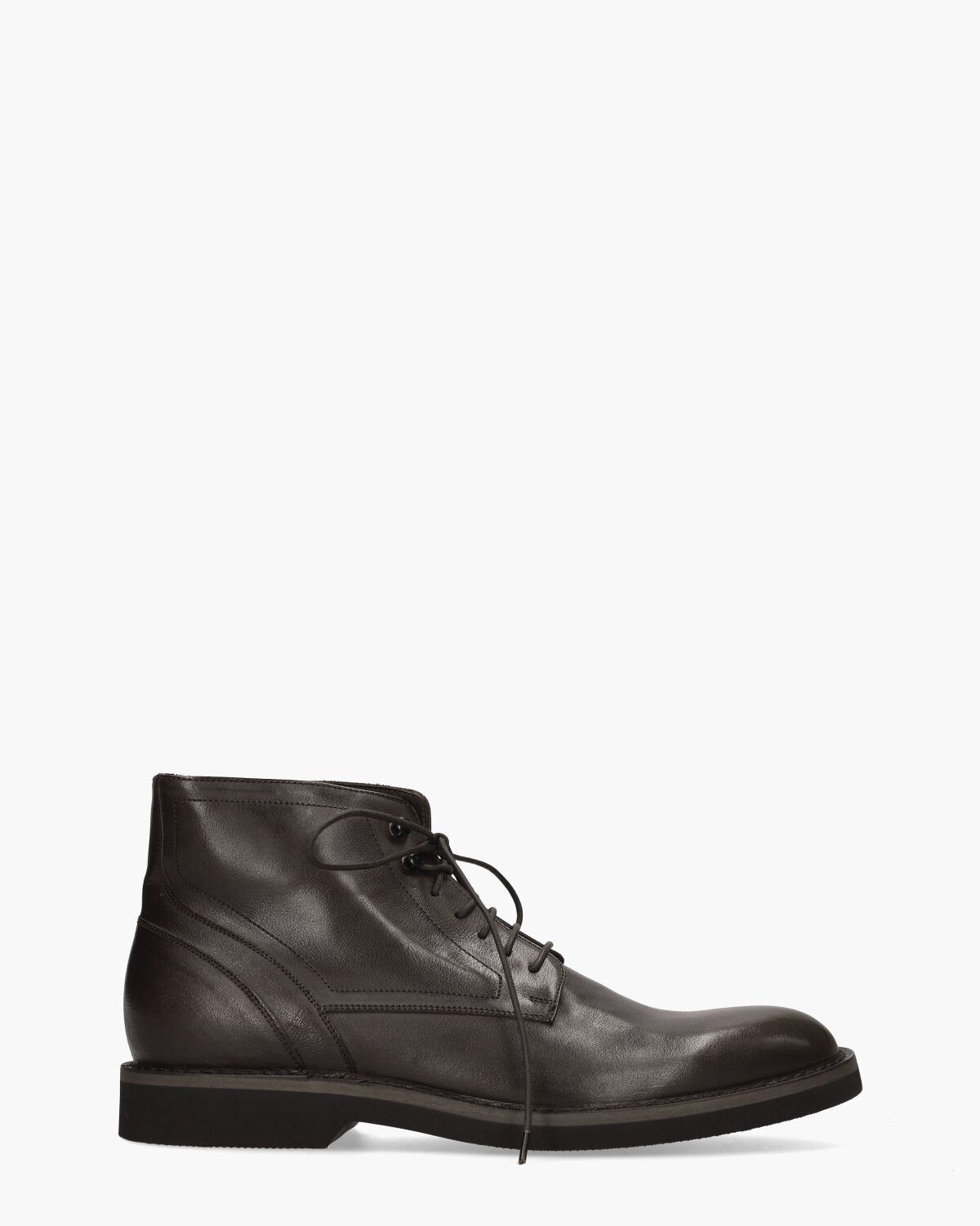 Veterboots voor heren, model 18404E, van het Italiaanse merk Pantanetti. Deze verfijnde, handgemaakte boots zijn vervaardigd uit soepel en glanzend donkerbruin leer met een karaktervolle, subtiele vintage finish. De binnenzijde is volledig uitgevoerd in leer en voorzien van een vast voetbed, wat zorgt voor een luxe draagervaring. Met een