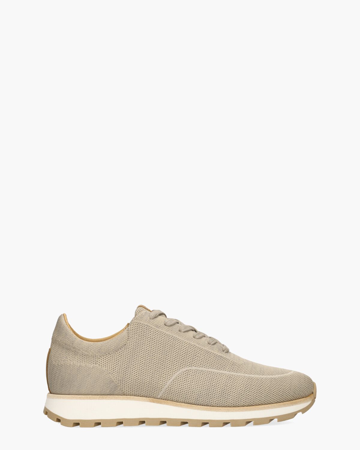 Sneakers voor heren Mason Knit uit de collectie van Rehab. Dit model heeft een bovenwerk van lichtgewicht beige knitwear dat zorgt voor een flexibele pasvorm. Cognackleurige lederen accenten op de tong en hiel geven de sneakers een subtiele, luxe touch. De binnenkant, uitgevoerd in een combinatie van leer en stof, biedt een prettig