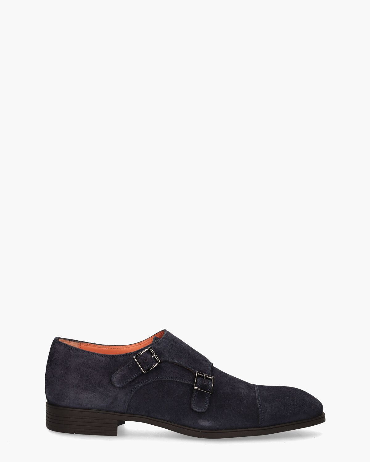 Geklede gespschoen 14549 voor heren handmade in Italië van het merk Santoni. Deze herenschoen uit de Santoni Heritage Collection heeft een upper van donkerblauw suède. De binnenkant is in soepel leer uitgevoerd. De dubbele donkere metalen buckle-sluiting en naad over de neus geven de moncks een stijlvolle twist. Zowel de zool als de hak zijn