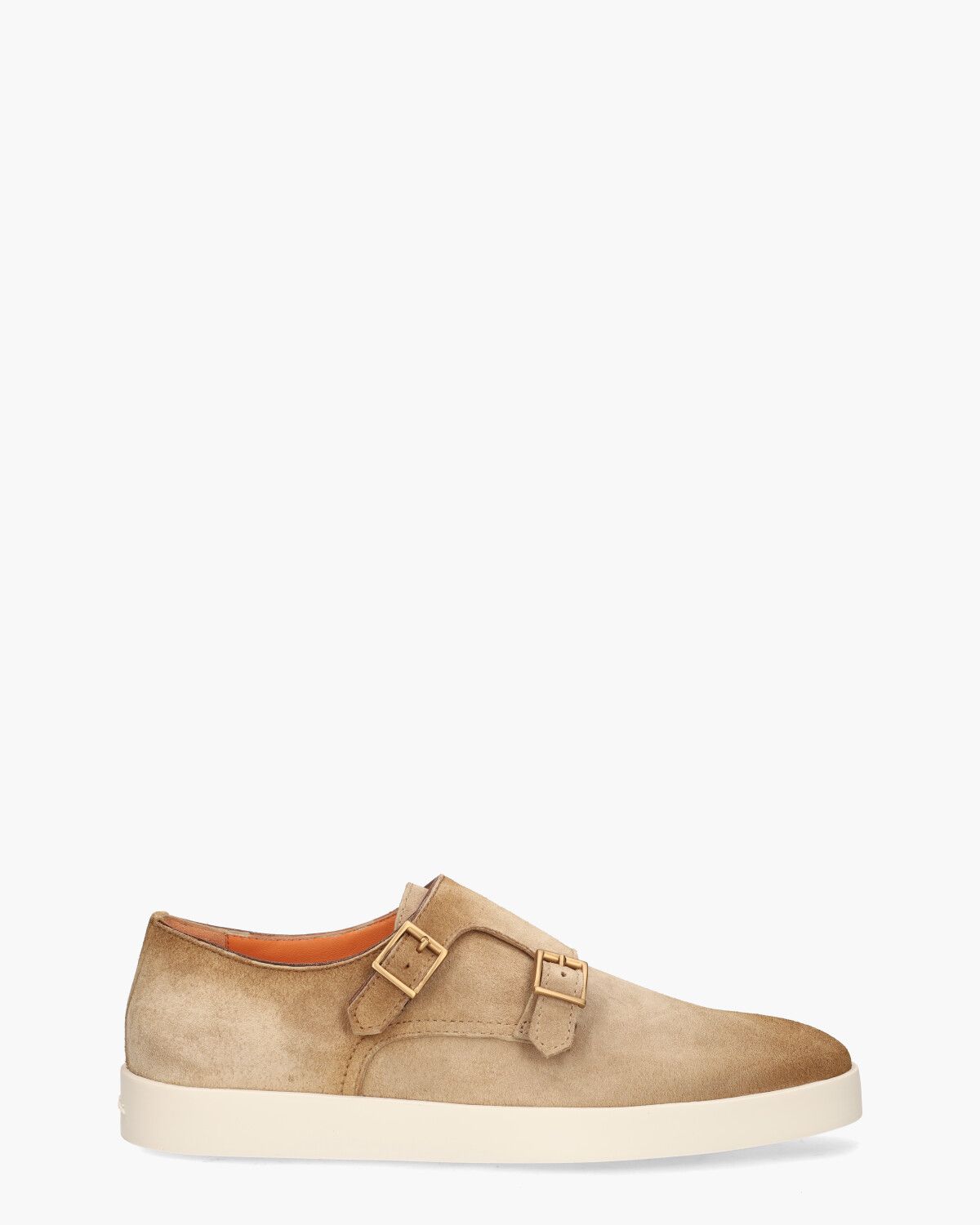 Gespschoenen voor heren, model 17832, van het iconische Italiaanse merk Santoni. Deze met de hand vervaardigde monks stralen klasse uit met hun upper van gewassen en geborsteld suède, gehuld in een lichtbruine tint. De binnenzijde is met zorg uitgevoerd in soepel leer en beschikt over een uitneembaar voetbed, wat bijdraagt aan het